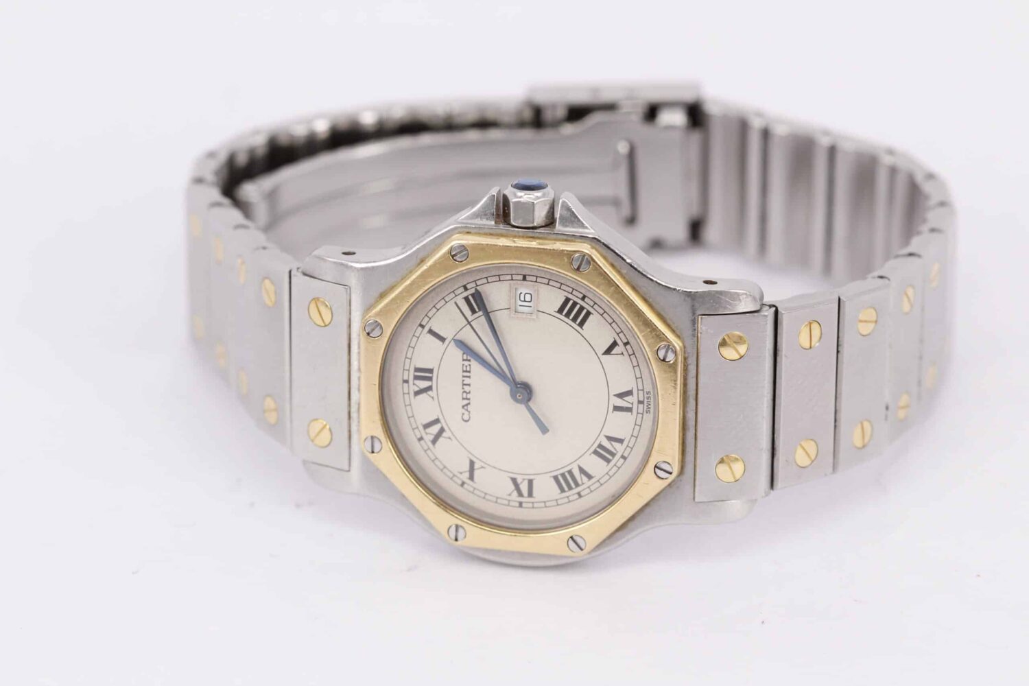Cartier Octagon er kendetegnet ved sin karakteristiske ottekantede kasse, som giver et mere moderne udtryk end de klassiske runde dress-ure. Denne udgave er udført i stål med bezel i 18k guld, hvilket giver en raffineret kontrast og gør uret velegnet til både hverdag og mere formelle anledninger. Kassen måler ca. 28 mm, men bærer sig visuelt større pga. den kantede form og den gyldne bezel.Skiven er klassisk Cartier: hvid med sorte romertal, minutiøs “railroad minute track” langs kanten og blånerede stål-hænder. Kronen prydes af den ikoniske blå cabochon-safir, et af Cartiers mest genkendelige kendetegn.Uret drives af et præcist quartzværk, der sikrer høj driftssikkerhed og minimal vedligeholdelse.