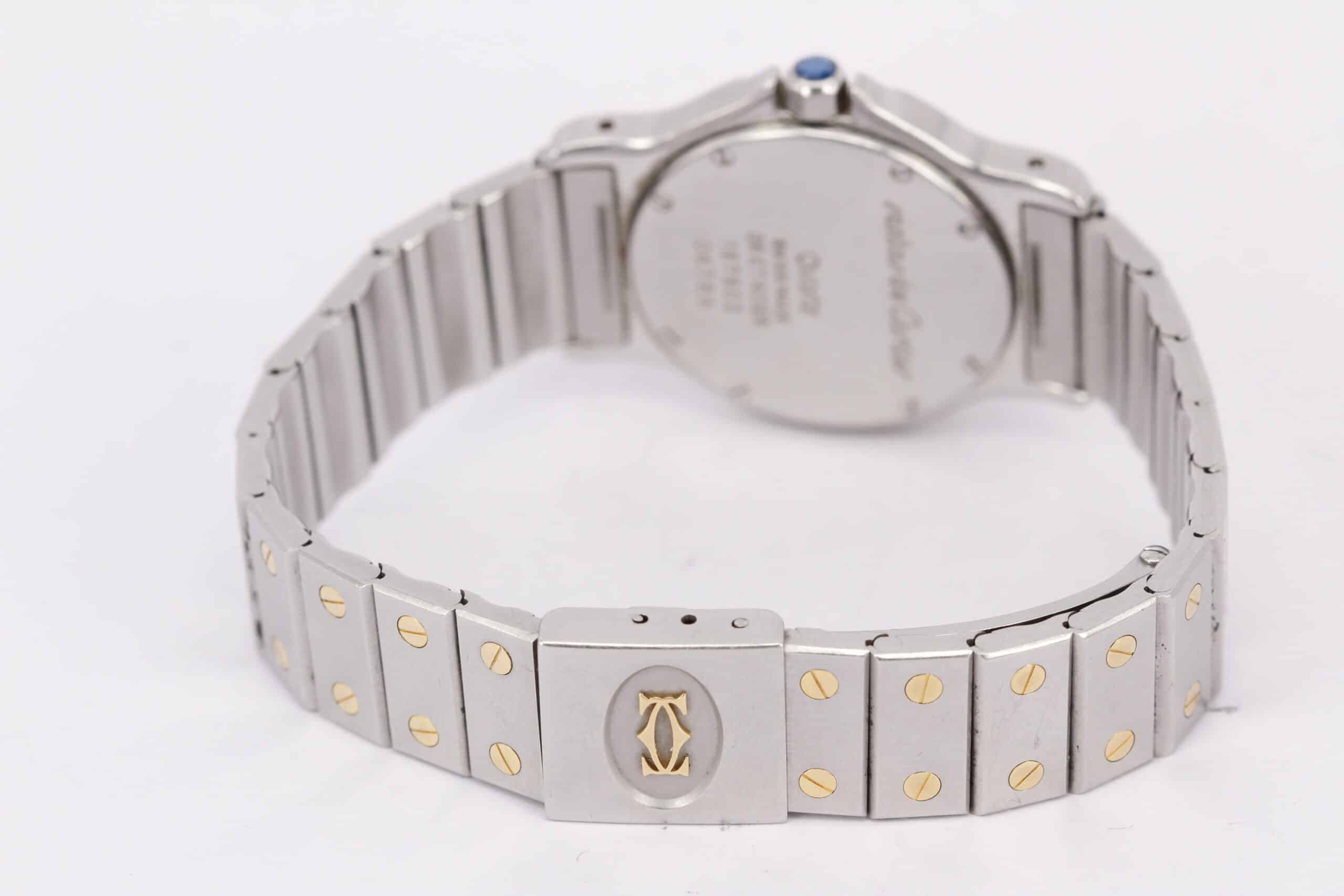 Monteret på originalt Cartier lænke i stål med 18k guldmidterled, der matcher kassen perfekt. Den integrerede lænke gør uret komfortabelt at bære og fremhæver det harmoniske design.