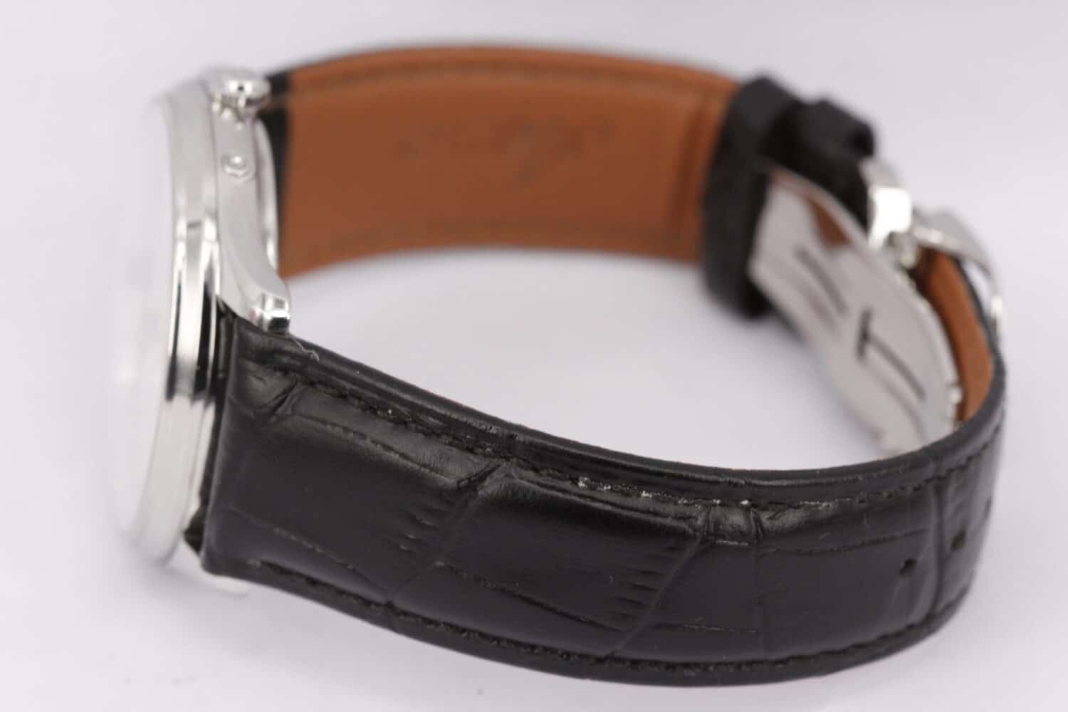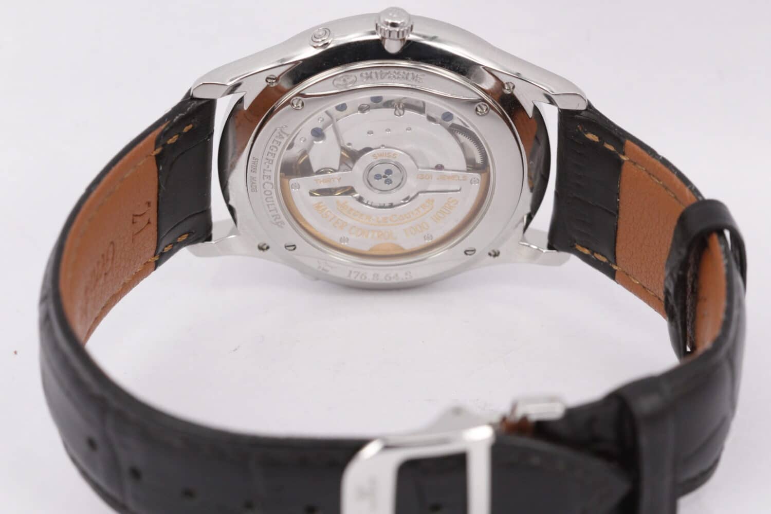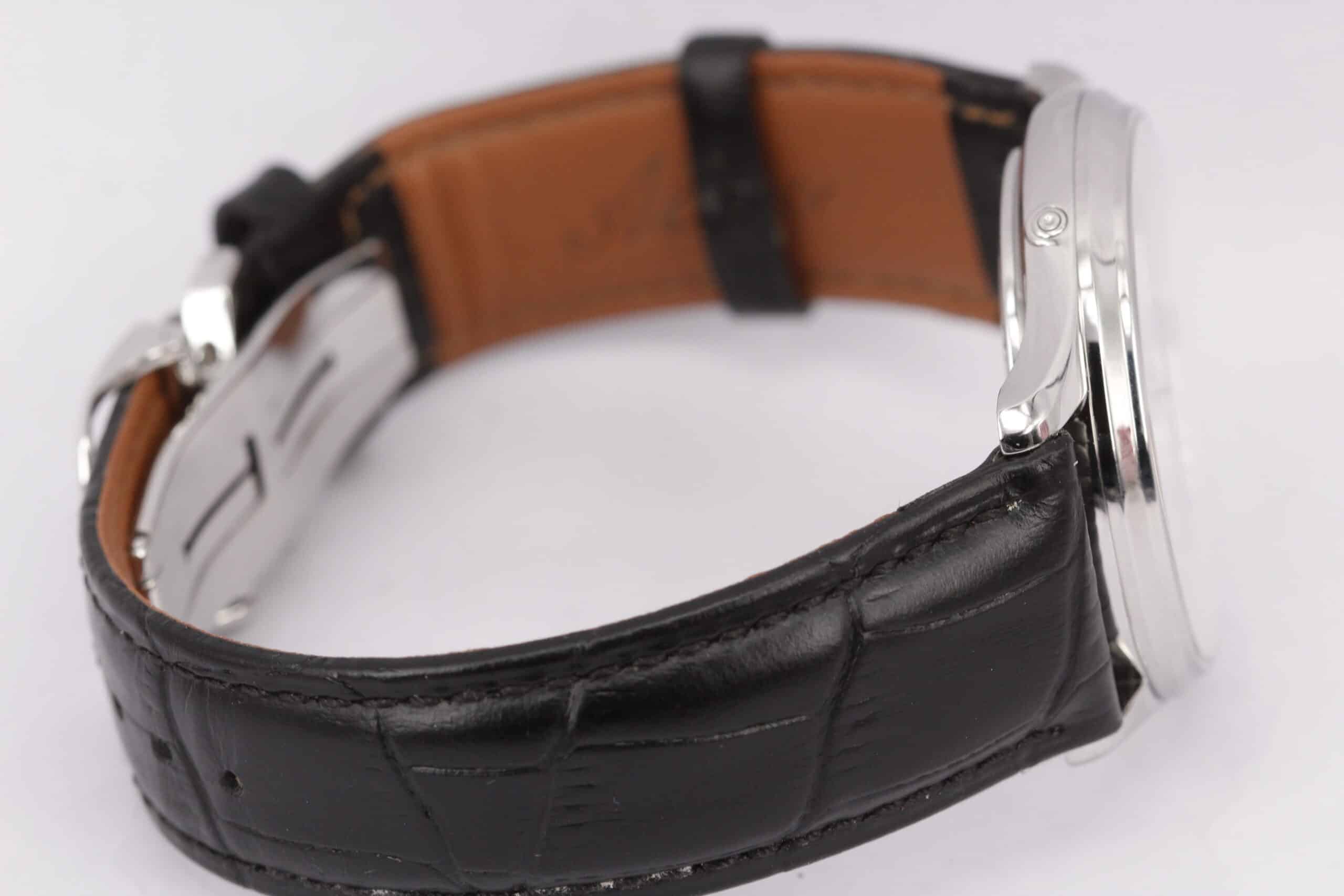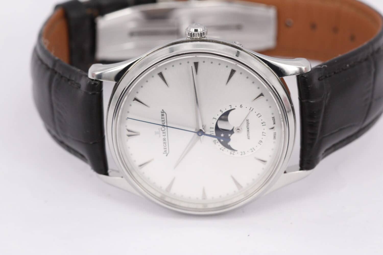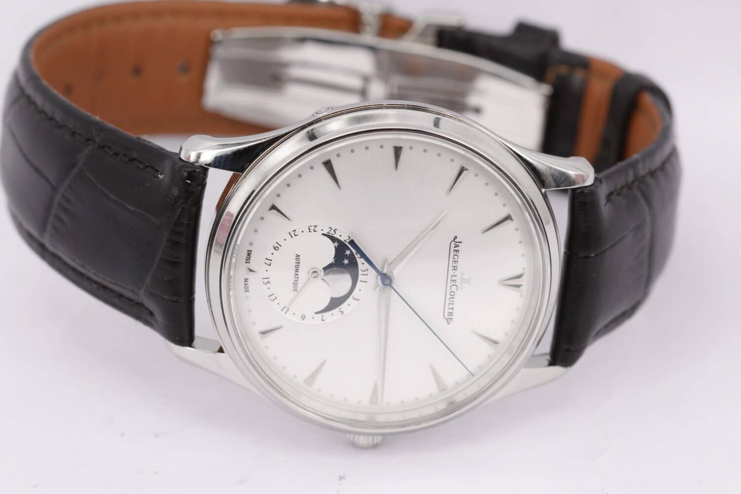 Til salg er dette Jaeger‑LeCoultre Master Ultra Thin Moon Q1368420 fra 2015 er et klassisk dresswatched, Med sin slanke profil sølvskive og månefasen ved 6‑tiden kombinerer det klassisk stil med moderne teknik. Kaliber 925 bringer en bemærkelsesværdig 70‑timers gangreserve og udsøgt finish, alt sammen synligt gennem en transparent bagkasse. Det føles let og elegant, ideelt til formal attire, men robust nok til at håndtere hverdagsbrug.