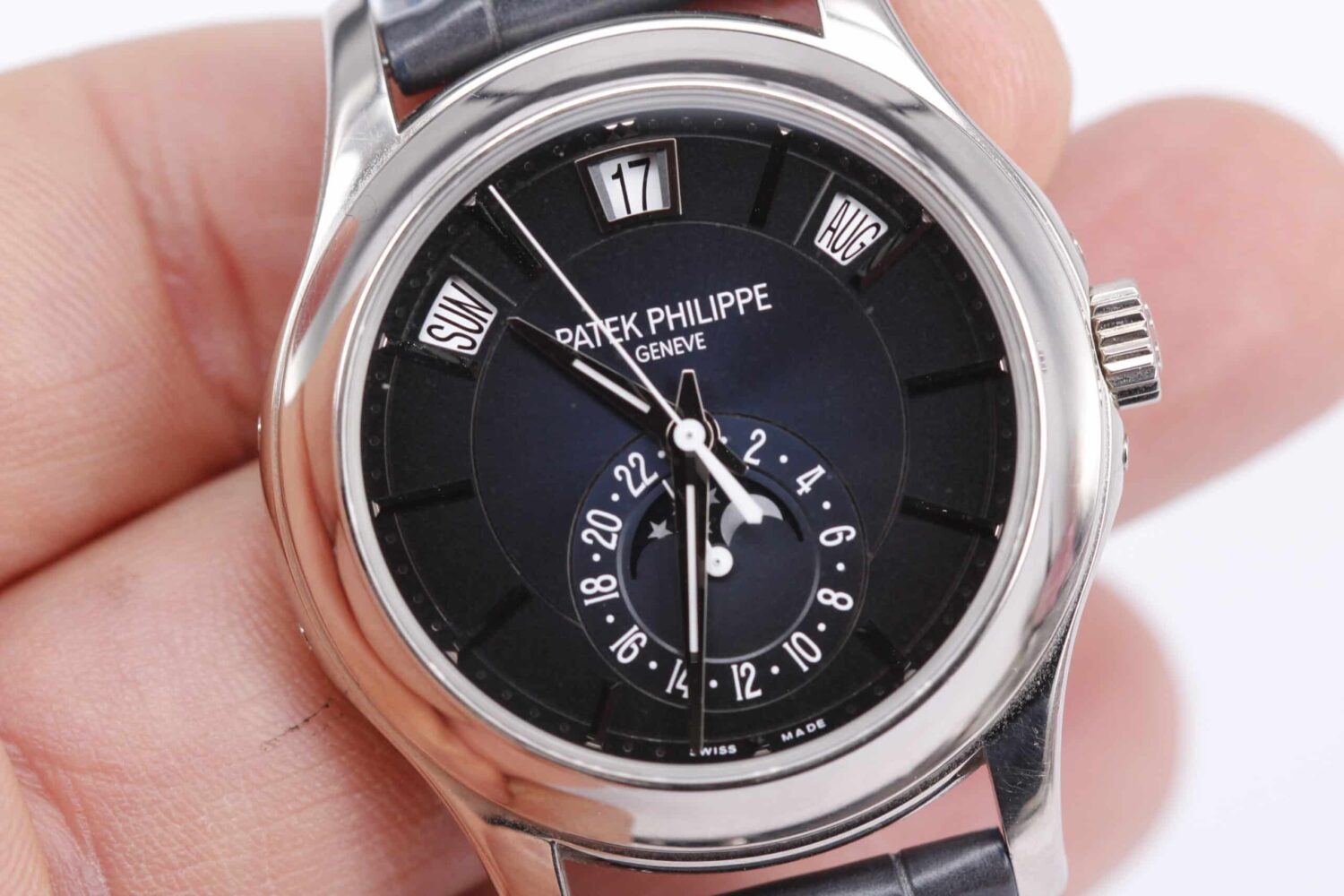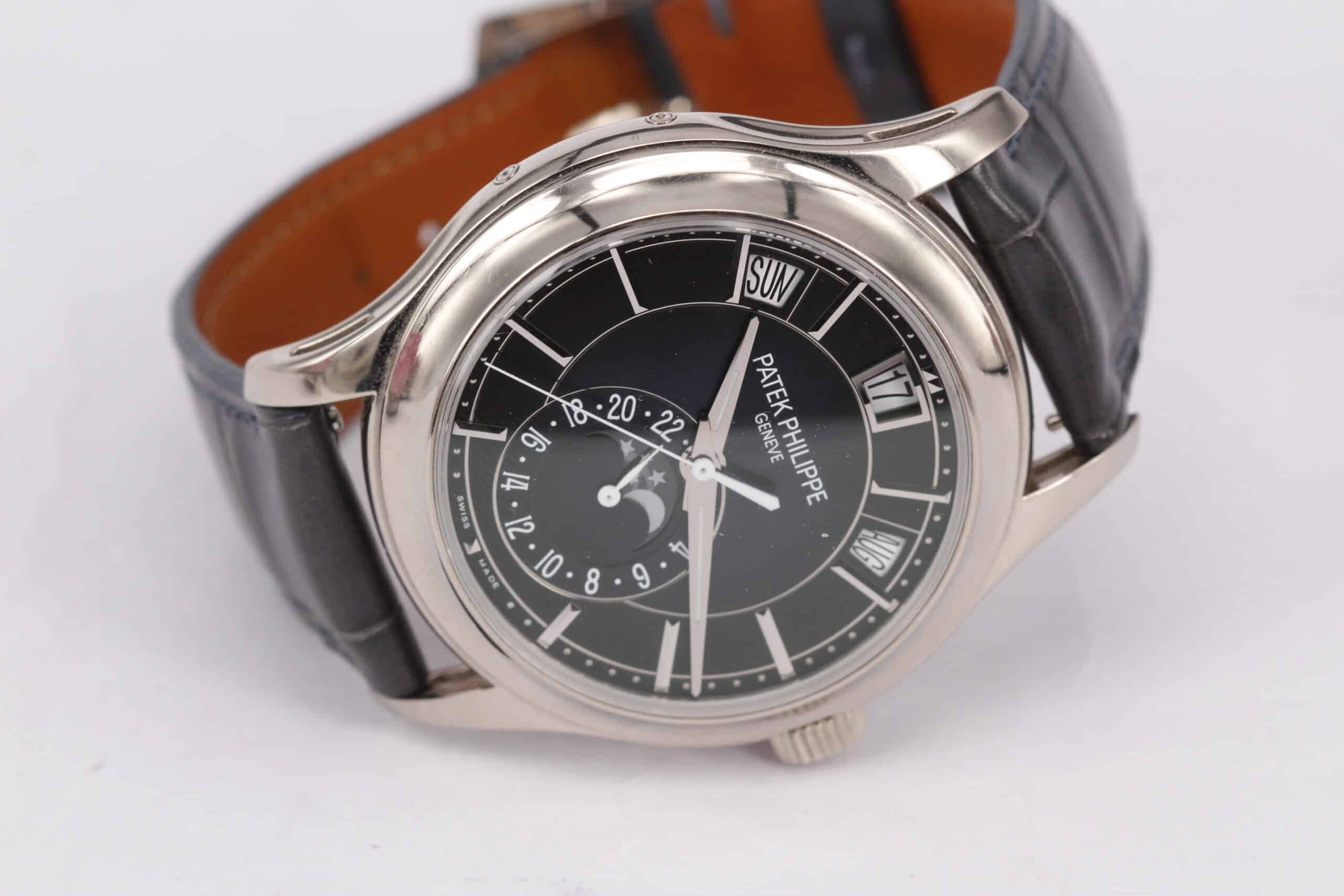 De tre harmonisk placerede aperturer ved kl. 10, 12 og 2 – dag, dato og måned – danner signaturen for 5205-serien: et rent, symmetrisk og moderne take på årskalender-komplikationen. Under klokken seks finder du månefasen, svævende over en lille 24-timers visning, som tilføjer både funktion og poesi. Hver detalje er skarp, men blød i finish; viserne er slibede i flere facetter, og indekserne er polerede i hvidguld, hvilket giver et stille spil mellem lys og skygge.