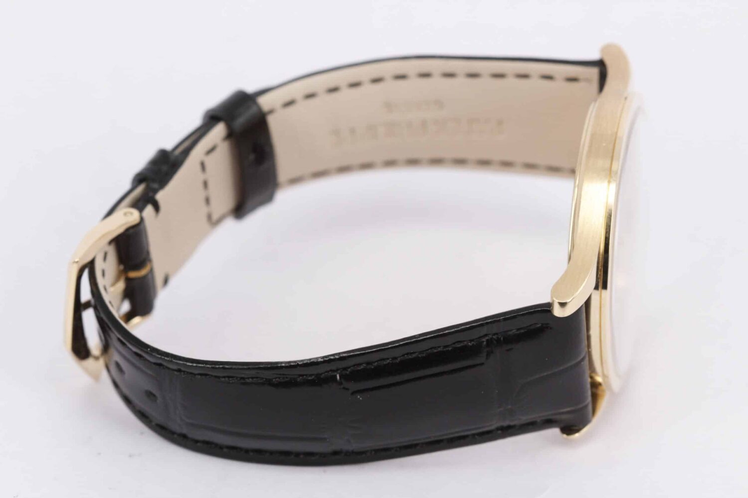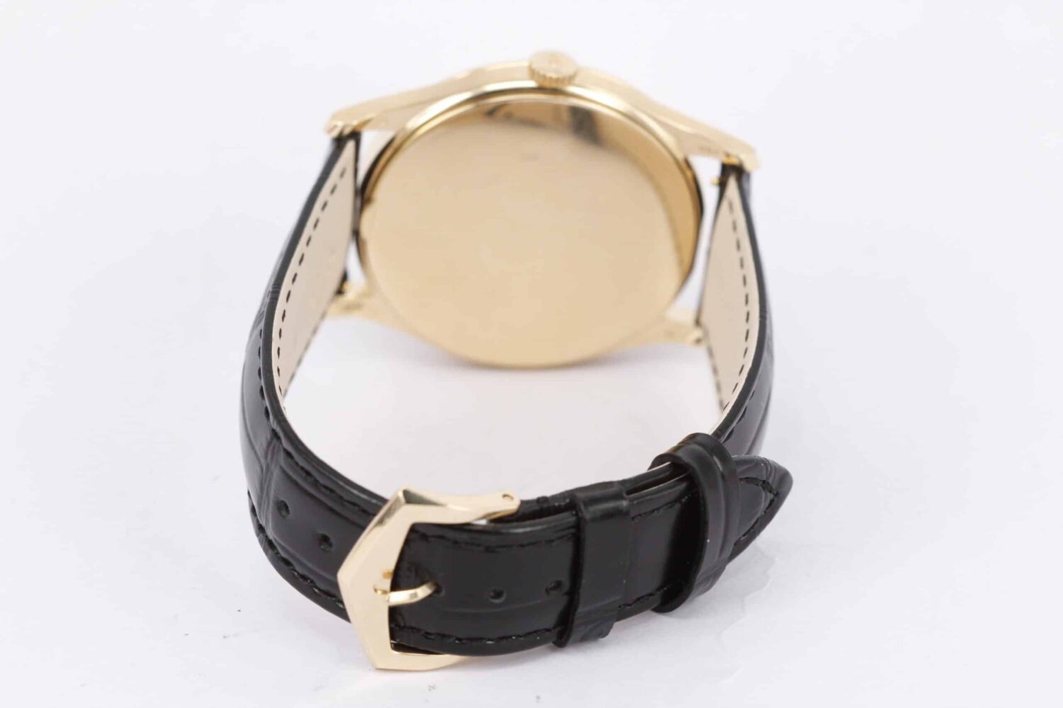 Uret fremstår i klassisk 18 karat gult guld, med de karakteristiske, afrundede linjer og en smal profil, der glider perfekt under manchetknappen. Kassen måler 37 mm i diameter, en ideel størrelse, der både respekterer vintage-proportionerne og samtidig føles moderne på håndleddet.