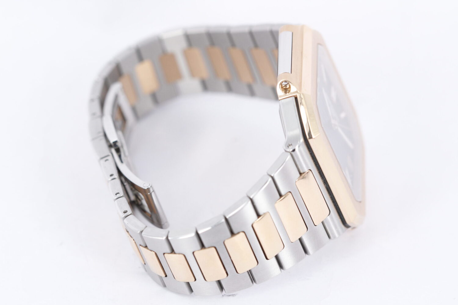 Urkassen måler 45 mm diagonalt (målt over hjørnerne) og har et karakteristisk firkantet, afrundet design, der giver modellen en stærk identitet på håndleddet. Den elegante blå sunburst-skive spiller smukt i lyset og fremhæves af påsatte timemarkeringer og visere i rosaguld med selvlysende materiale. Datovisningen er diskret integreret og bidrager til urets funktionelle balance.