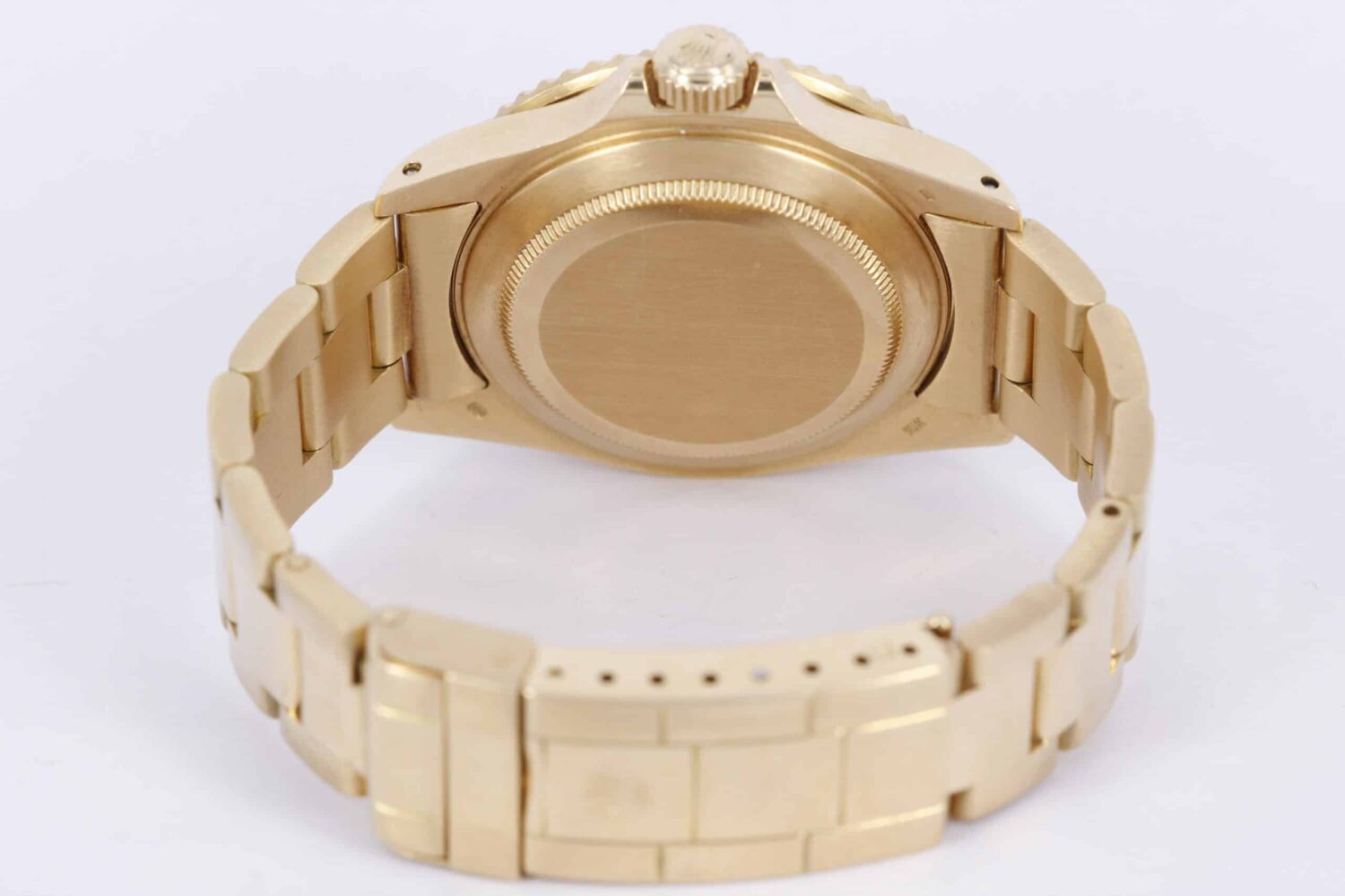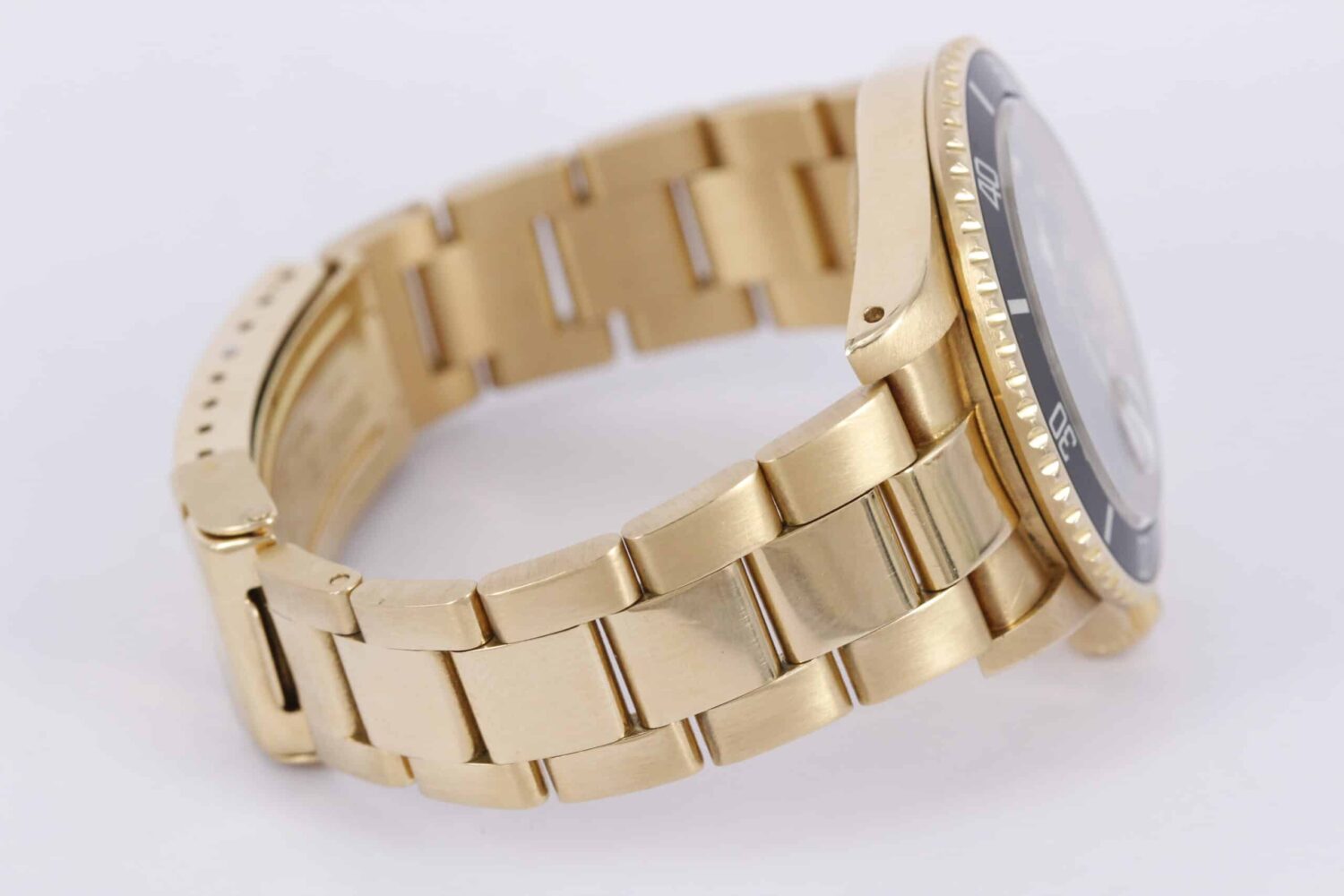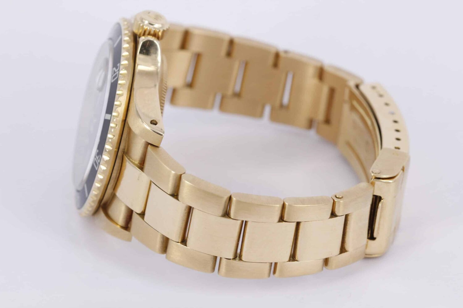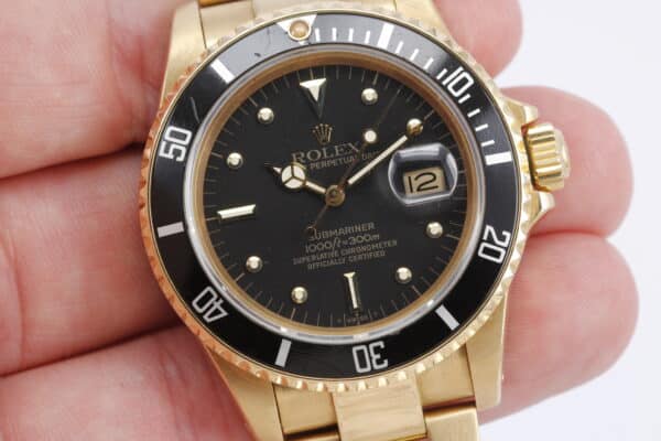 Elegant og klassisk Submariner i guld. Uret måler 40mm, og har en flot støvet sort skive med nipple time indikatorer. Uret er monteret på en oyster guld lænke.